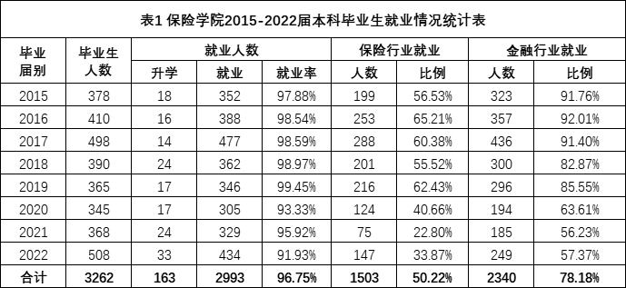 2015-2022年,yl88858永利集团毕业生人数为3262人,其中升学人数为163人,就业人数为2993人,平均就业率为96.75%。从就业的行业来看,从事保险行业的毕业生有1503人,占约50.22%;从事大金融行业的毕业生有2340人,占约78.18%。