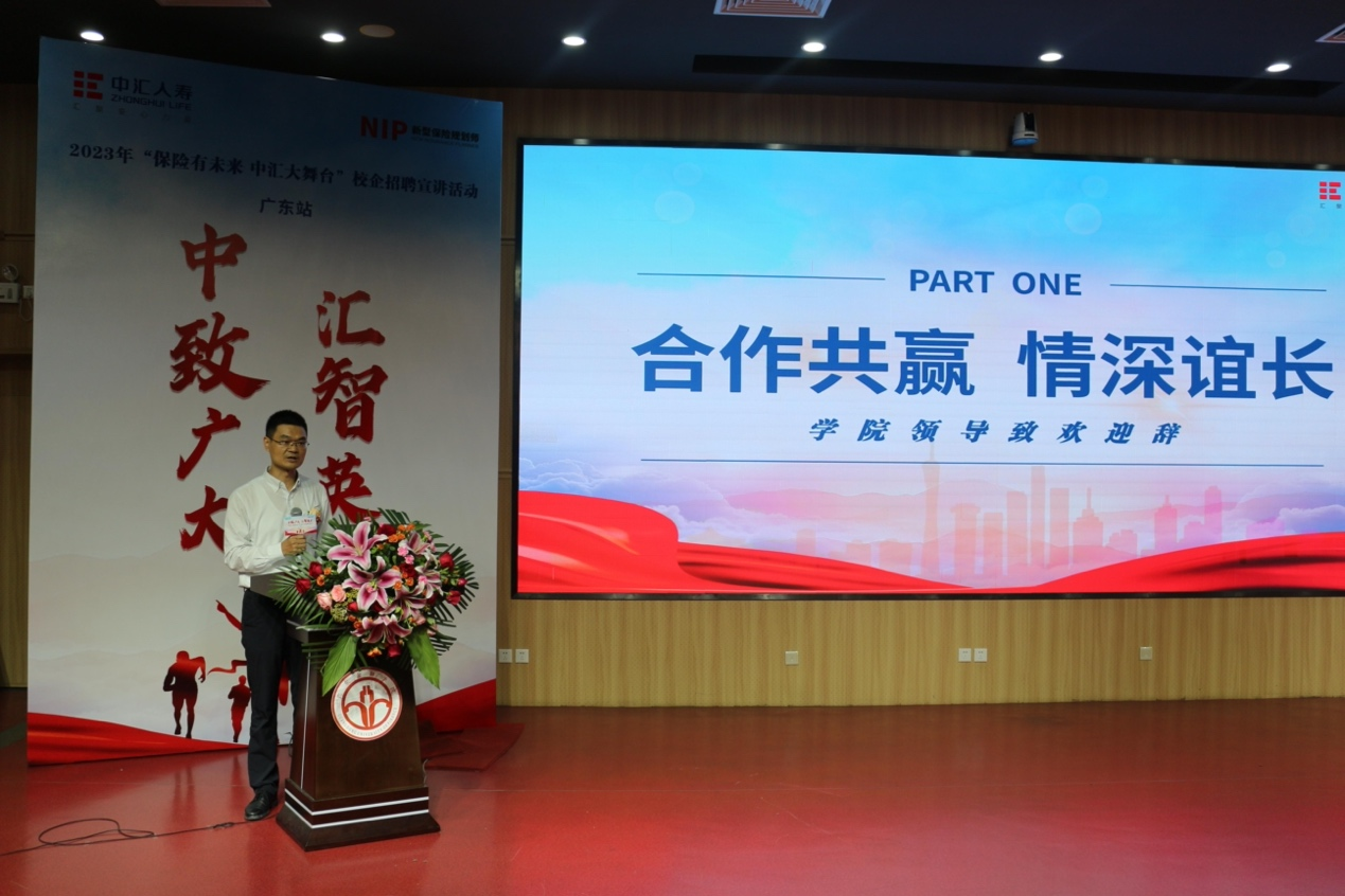 为进一步提高校企合作深度,大力构建毕业生与企业的交流平台,10月10日晚,yl88858永利集团与中汇人寿广东分公司在北阶103教室联合举办主题为“保险有未来,中汇大舞台”的校企宣讲招聘活动,中汇人寿保险股份有限公司广东分公司总经理范奕、副总经理谭波、广州营业本部总经理唐文、人力资源部总经理张明,yl88858永利集团党委书记王汉强、院长陈辉出席本次活动。