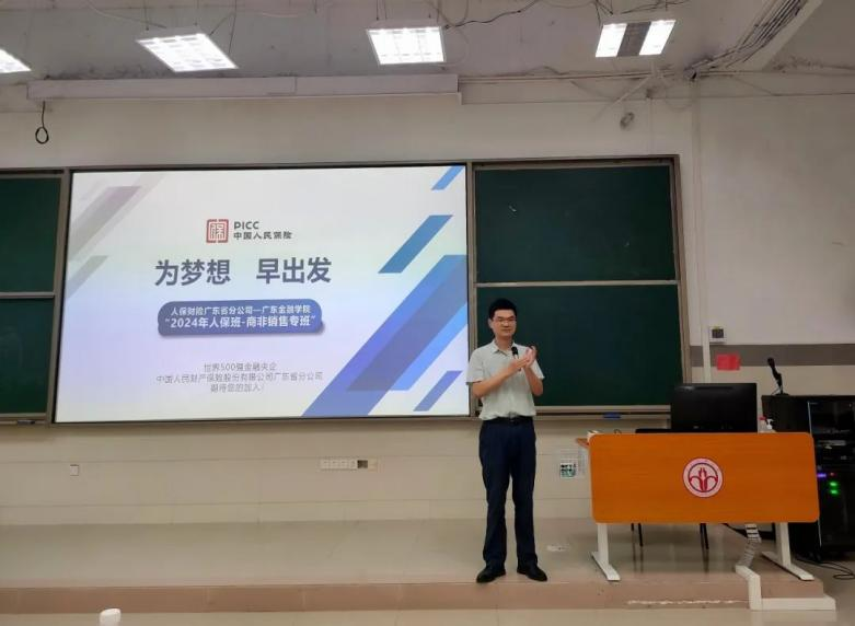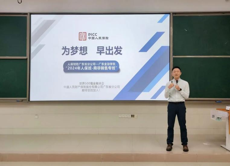 人保财险刘晓东老师对学院领导、老师们的拨冗出席与同学们的冒雨前来表示感谢。他表示,人保财险广东省分公司与广金yl88858永利集团有着深厚的合作基础,再次来到广金进行宣讲的他感到十分亲切。同时,他将在宣讲会中从企业介绍、办班背景、办班模式、互动答疑等方面向现场人员详细介绍2024年“人保班”。