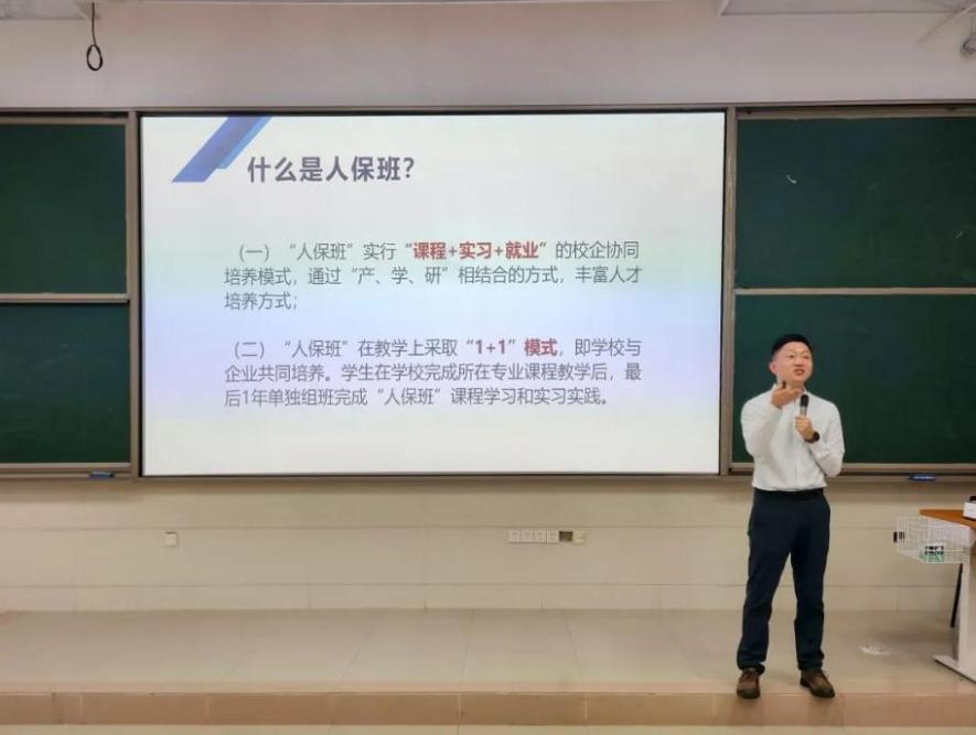 接下来,刘老师为大家详细介绍了“人保班”的办班模式:在培养模式上实行“课程+实习+就业”的校企协同培养模式;在教学上则采取学校与企业共同培养的“1+1”模式。