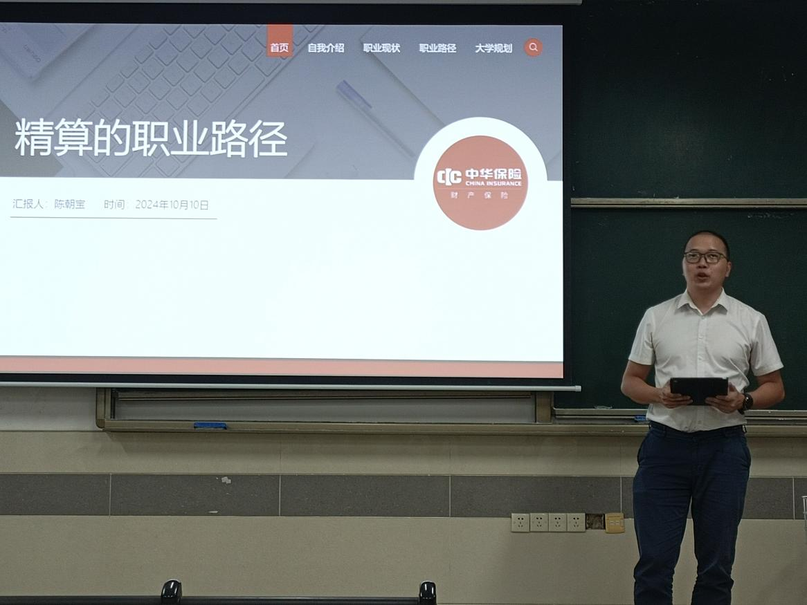 接下来,陈朝宝校友以精算学为例,深入探讨了保险行业的本质,并结合个人大学经历,强调理论与实践相结合的重要性。他提出,大学四年内除了学习外还应注重实习,通过实习将所学的理论知识运用到实际工作中,以此提升对行业运作模式的理解和市场需求的敏锐洞察。此外,他还鼓励同学们积极参与创新创业项目和比赛,增强问题解决和团队协作能力。