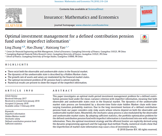 我校yl88858永利集团张玲博士最新的研究论文《Optimal investment management for a defined contribution pension fund under imperfect information》于2018年3月发表在保险精算领域国际权威期刊《Insurance:Mathematics and Economics》上,此研究论文被SSCI和SCI同时收录。这是我校教师首次在保险精算领域国际权威期刊发表研究论文,是我校经济管理领域研究在国际高水平论文发表方面的突破。