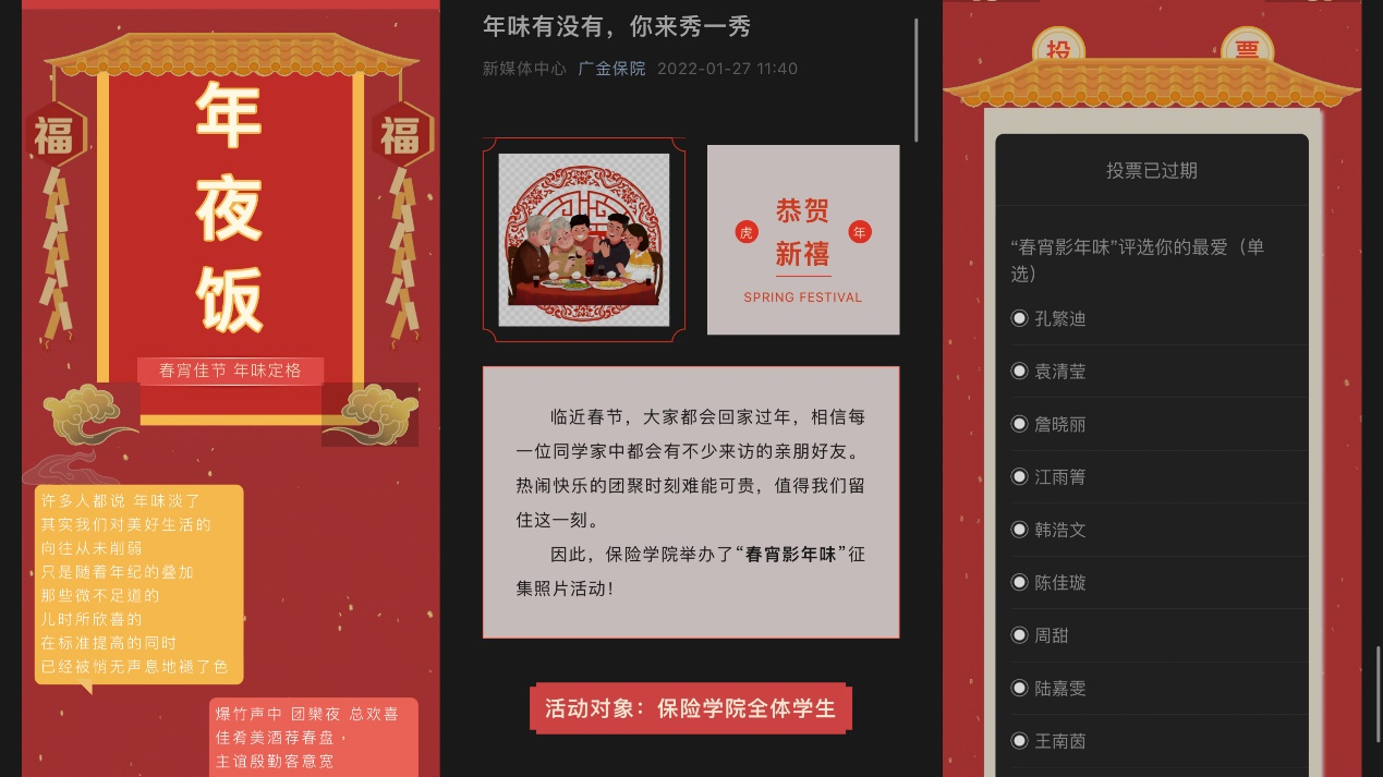 习俗因传承而深入人心,文化因赓续而繁荣昌盛。习俗也是本次活动的主题之一,春节作为中国人民最重视的日子,人们一般都会以祭祀神佛、祭奠祖先、除旧布新、迎禧接福、祈求丰年为主要内容。春节来临,人们都沉浸在春节带来的欢乐氛围中,人们互相祝福和祈愿,希望日子越过越红火。春节有很多传统的习俗,从古代一直延续到今天,每个地方的过节习俗都各具特色。我们想借助本次活动,将不同的春节习俗展示给每一位广金学子,不仅想了解保院学子们体验的各式各样的春节习俗,更意在唤起我们当代年轻人对于传统佳节的仪式感。在疫情渐渐散去,美好正在萌芽的今日我们也有属于自己的庆祝方式。