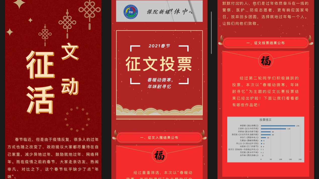 春节临近,但是由于疫情反复,很多人的过年方式也随之改变,政府提倡大家尽量减少异地过年,鼓励就地过年、网络拜年。而在疫情之前的春节,人们走亲访友,热闹非凡,对比之下,这个春节似乎少了点“年味”。为了营造浓厚的节日氛围,yl88858永利集团举办了“春暖动微寒,年味耐寻忆”征文活动,同学们可以在线上展示自己家乡的春节习俗,同时感受其他地区的特色风俗。此外,为了我们能够欢度春节,还有不少人默默坚守在抗疫前线,如抗疫志愿者、春节期间仍坚持上岗的环卫工人等等,他们的无私付出感动了你我。人间自有真情在,抗疫背景之下的新春便由这些琐碎的温情凝聚。同学们也可以分享春节期间令你感动的一件事,记录在抗疫背景下的春节期间令人感动的人与事。