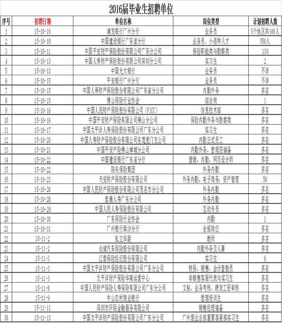 保险系2016届的应届毕业生共410人,保险实务专业为215人,其中男生69人,女生146人;风险管理与精算专业为195人,其中男生64人,女生137人。2016年10月,广东省公布的我系2016届毕业生初次平均就业率为98.04%。其中保险实务专业的初次就业率为98.14%;风险管理与精算专业的初次就业率为97.95%。另外,2016年,我系有7名同学考上国内硕士研究生,分别有北京师范大学、中南财经政法大学、西南财经大学、华南理工大学等知名院校;8人成功申请到国外攻读硕士学位;另有5人考取国家公务员。