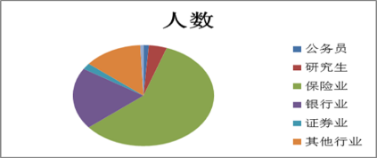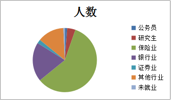 从就业的行业来看,从事保险行业的同学共241人,占约58.78%;从事银行系统的同学共81人,占约19.76%;考取国内外硕士研究生15人,占约3.65%。从以上数据可见,我系毕业生主要就业方向是保险行业,其次是银行系统。