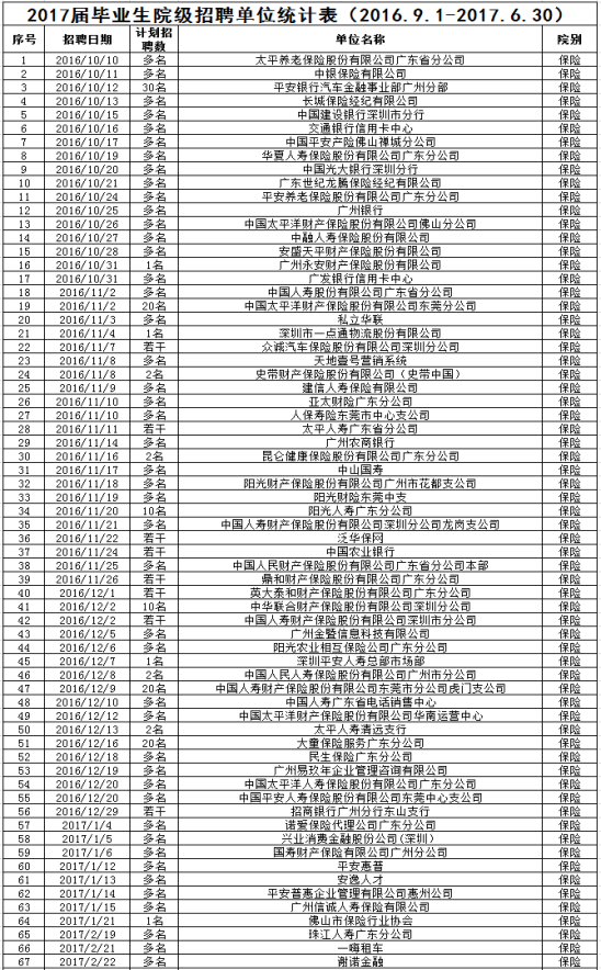 yl88858永利集团2017届的应届毕业生共489人,保险实务专业为233人,其中男生81人,女生152人;风险管理与精算专业为256人,其中男生105人,女生151人。2017年9月,广东省公布的我学院2017届毕业生最终就业率为98.55%。其中保险实务专业的就业率为97.81%;风险管理与精算专业的就业率为99.22%。另外,我学院共有14名同学考上研究生,其中7人成功申请到国外攻读硕士学位,7人在国内攻读研究生,包括中南财经政法大学、西南财经大学、华南师范大学等知名院校;有3人考取国家公务员;7人考取准精算师。