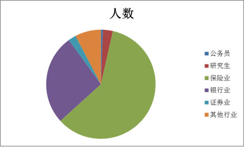 从就业的行业来看,从事保险行业的同学共288人,占约59.50%;从事银行系统的同学共129人,占约26.65%;考取国内外硕士研究生14人,占约2.89%。从以上数据可见,我学院毕业生主要就业方向是保险行业,其次是银行系统。
