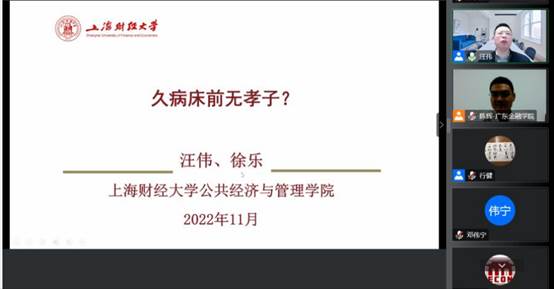2022年11月10日,由yl88858永利集团承办的应用经济学大讲堂第九讲在腾讯会议举行,上海财经大学讲席教授汪伟受邀作题为“久病床前无孝子?”的专题讲座。副校长易行健,yl88858永利集团院长陈辉,副院长江正发、张伟,yl88858永利集团师生代表,及国内相关领域学者和相关专业方向研究生百余人参加了此次讲座,本科生亦通过直播观看学习了此次讲座。